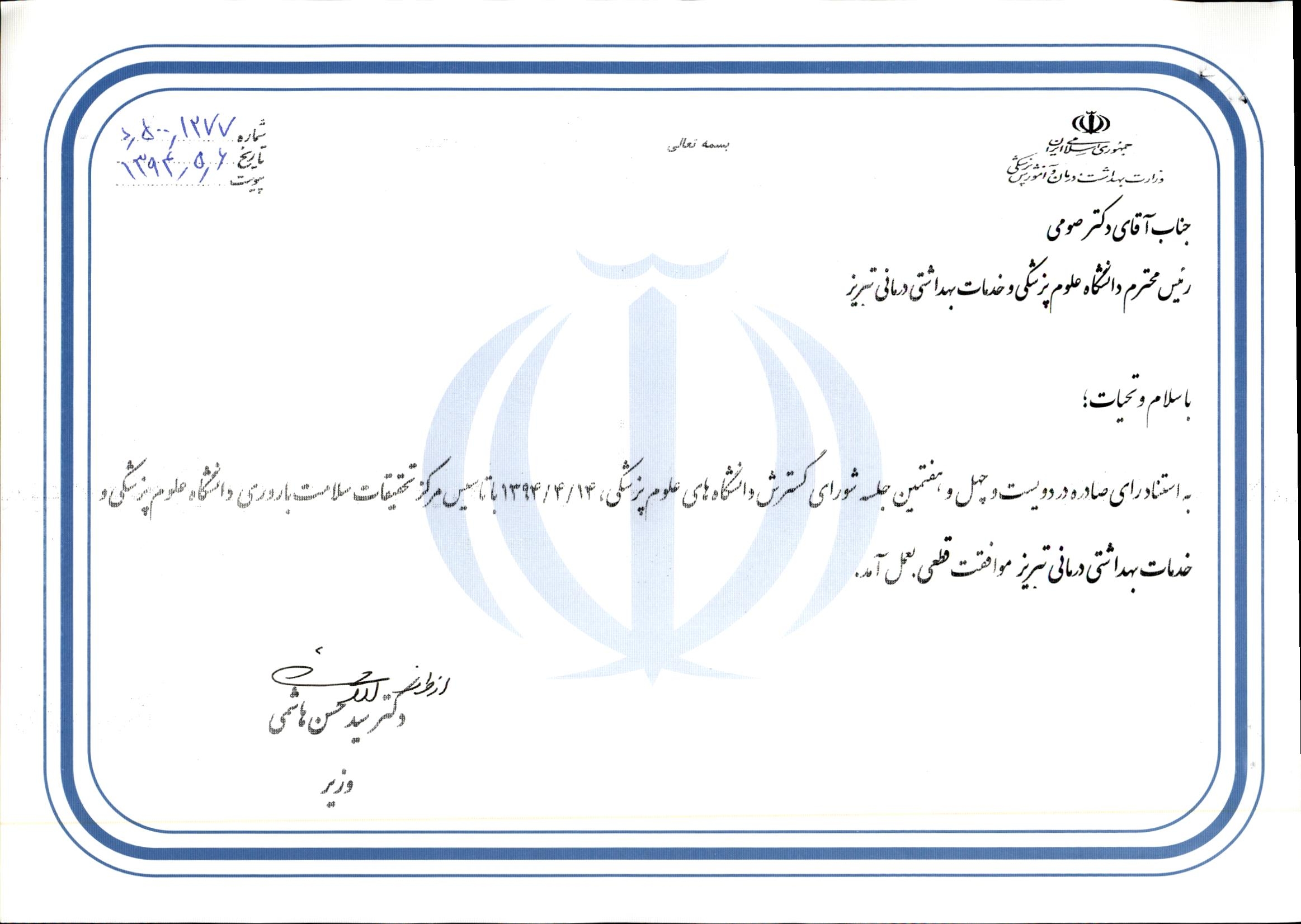 مرکز تحقیقات سلامت باروری زنان در تاریخ 1388/09/23 موافقت اصولی و در تاریخ 1394/04/14 موافقت قطعی دریافت نمود.